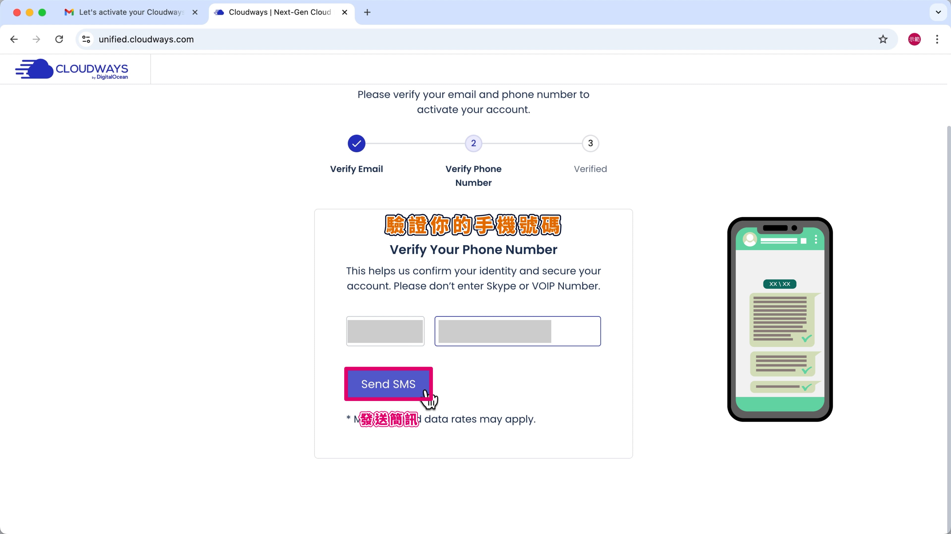 跳轉回到驗證步驟,國際電話區碼選擇你所在的地區,輸入手機號碼 —— 圖片標註 ➀。