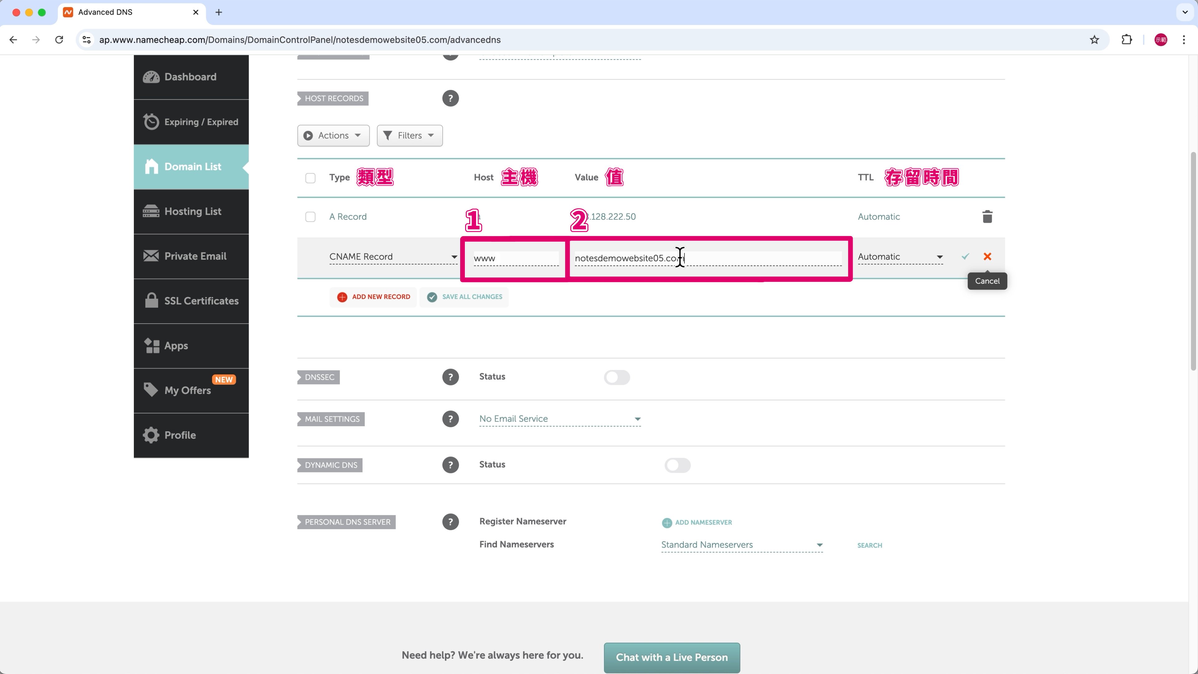 例如:主域名是 notesdemowebsite05.com,那麼填寫「www」表示這個 CNAME 紀錄是針對 www.notesdemowebsite05.com 的。