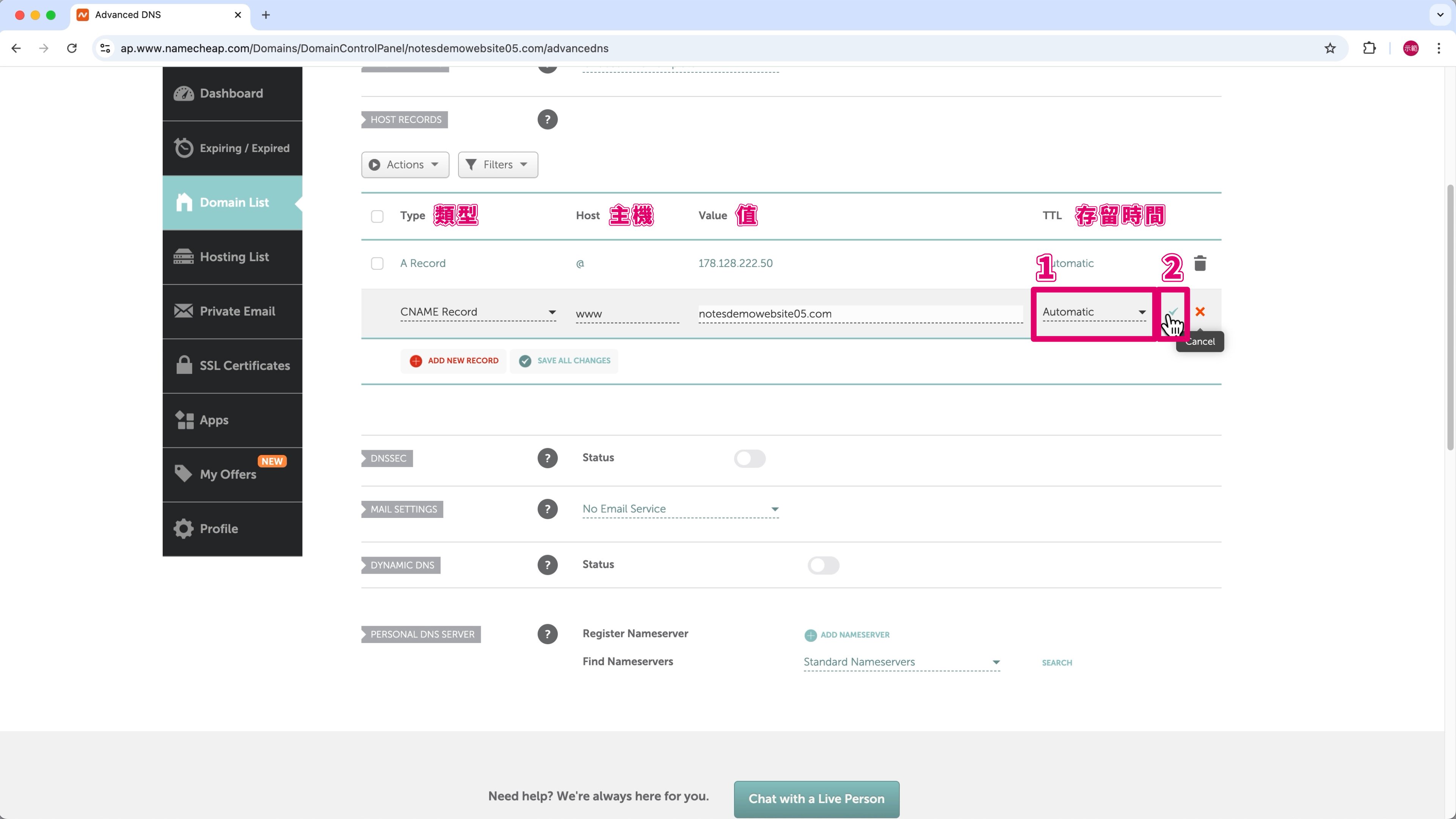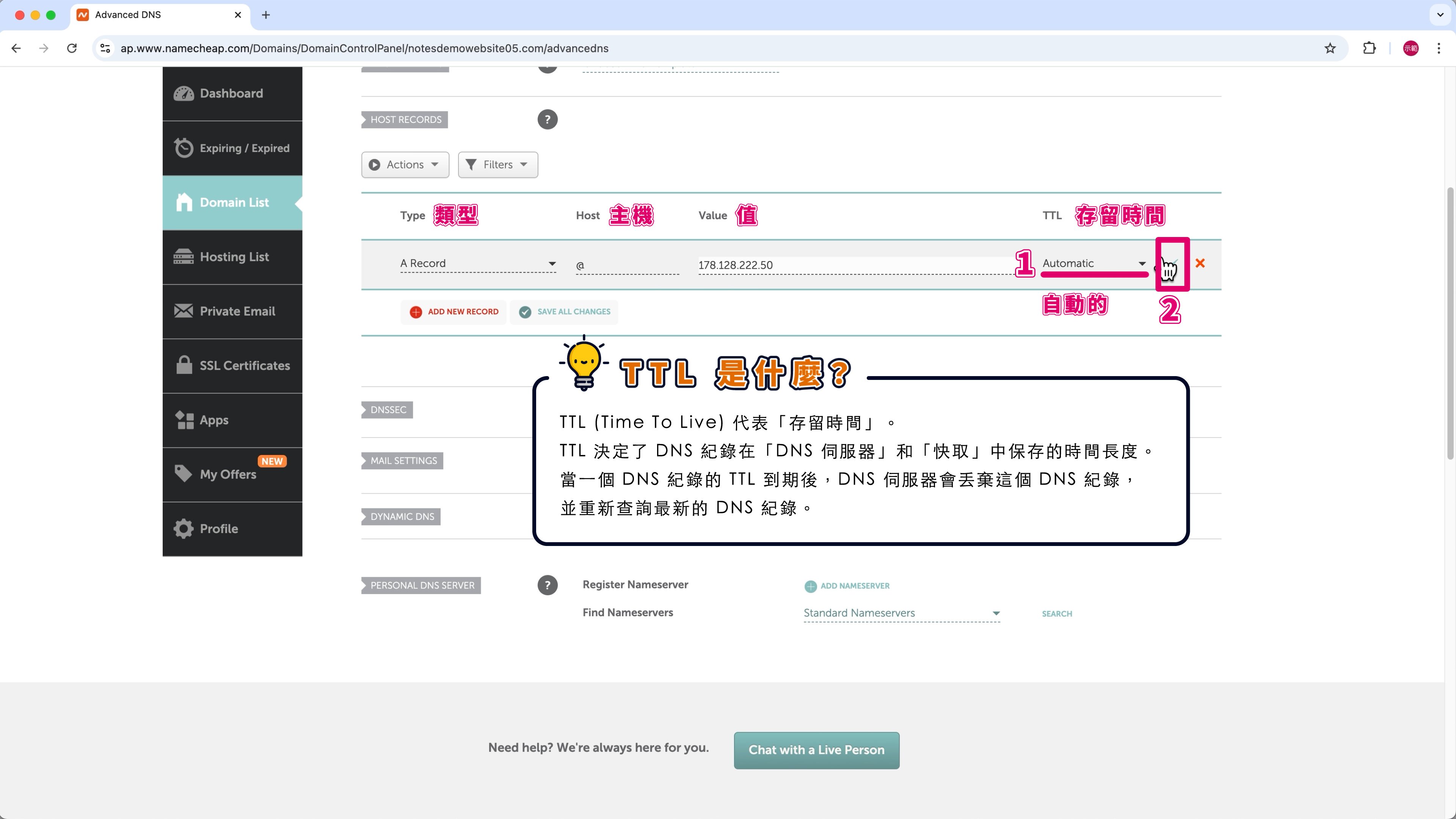 TTL (存留時間) 保持預設的「Automatic」(自動的) —— 圖片標註 ➀。