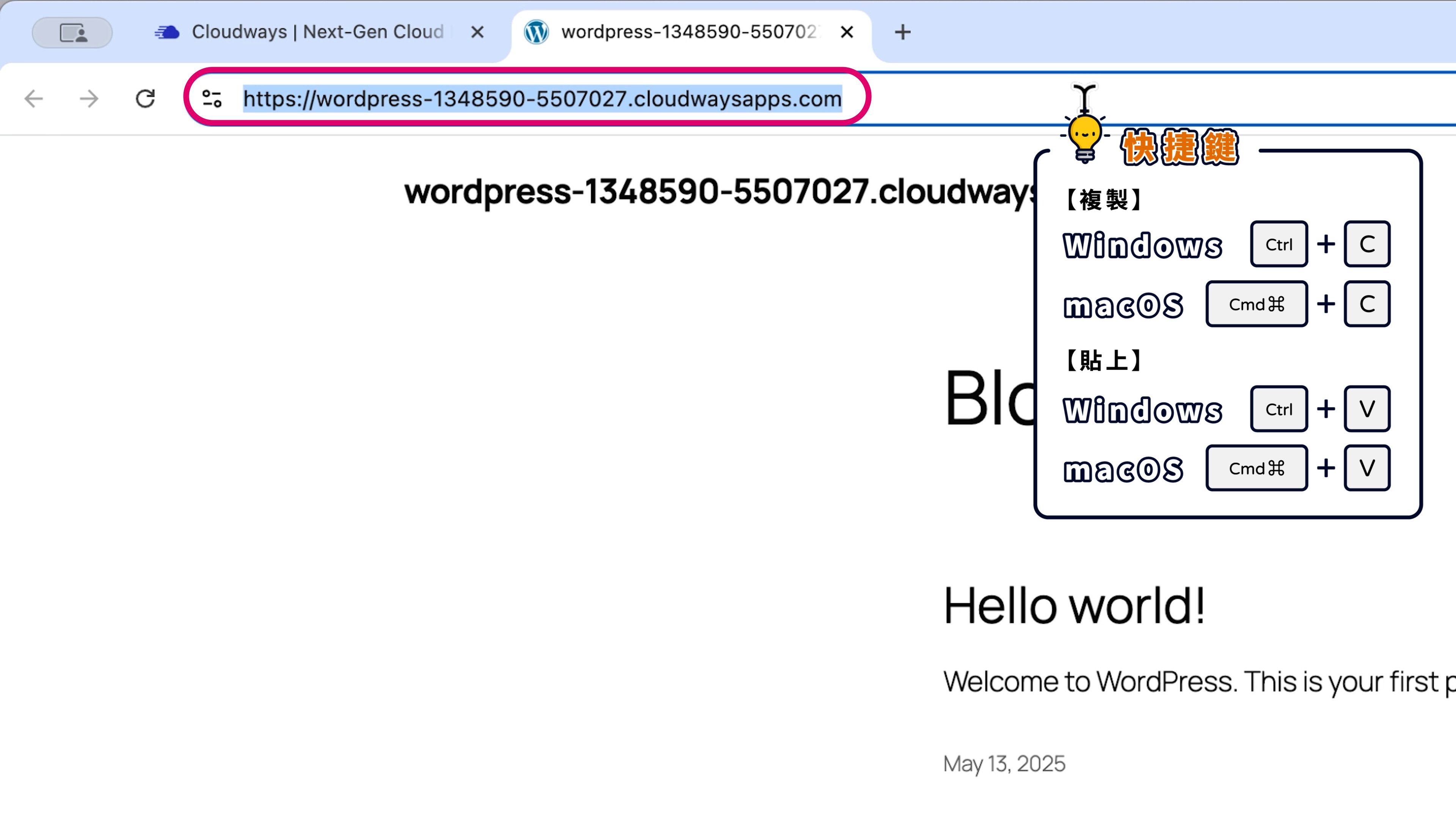 | 臨時網站 | Cloudways 主機 | Cloudways 提供的免費臨時域名 (例:wordpress-1201485-4245xxx.cloudwaysapps.com) |