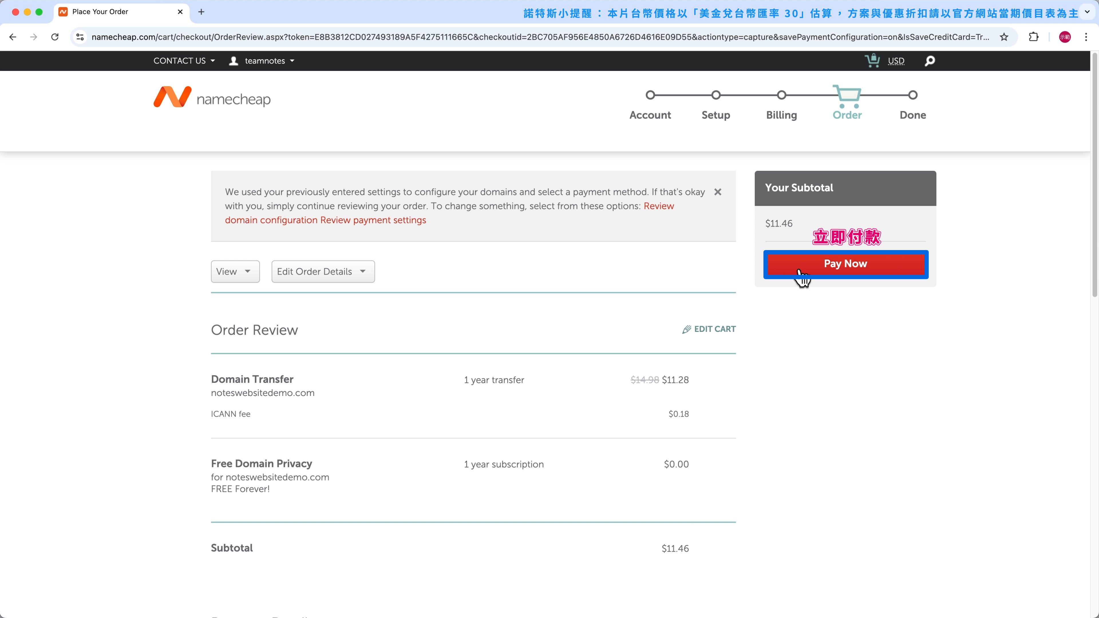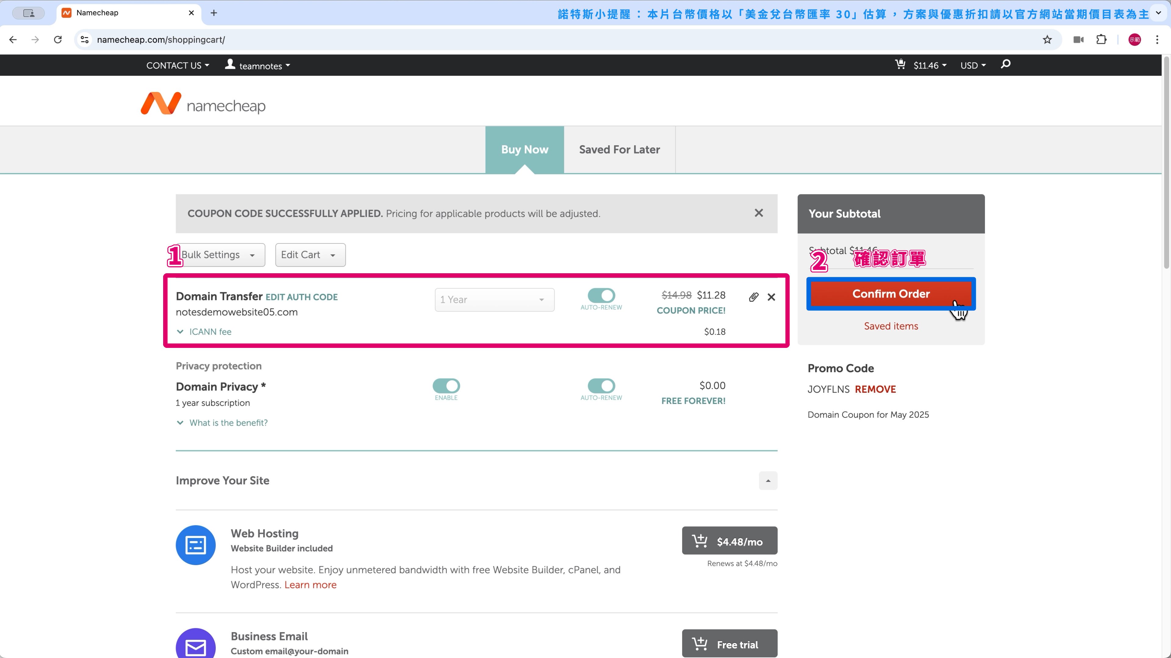 我搭配 Cloudways 主機使用的域名商是 Namecheap,第 1 年的優惠價格是 $11.48 美金 (約 $345 台幣)。