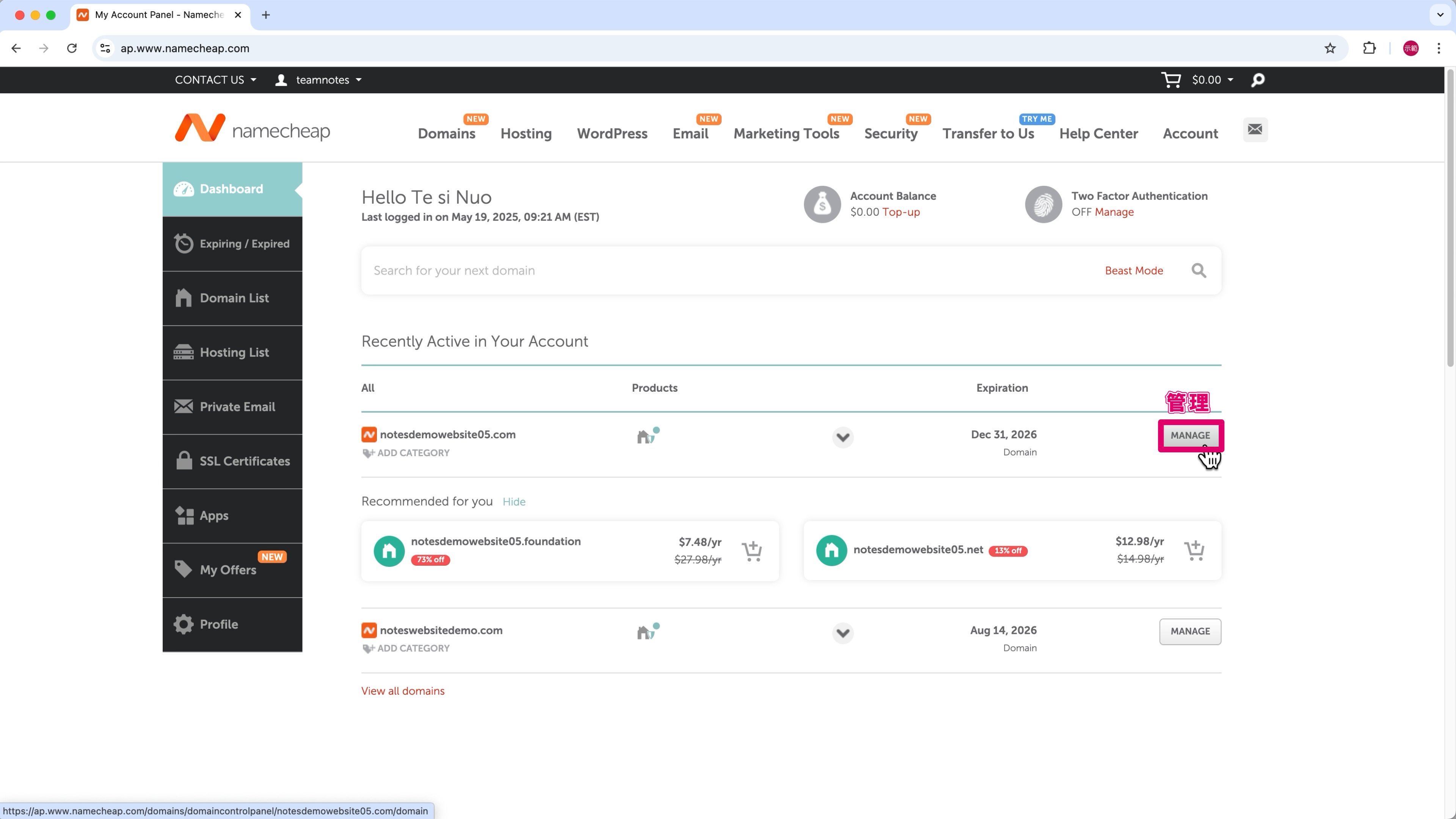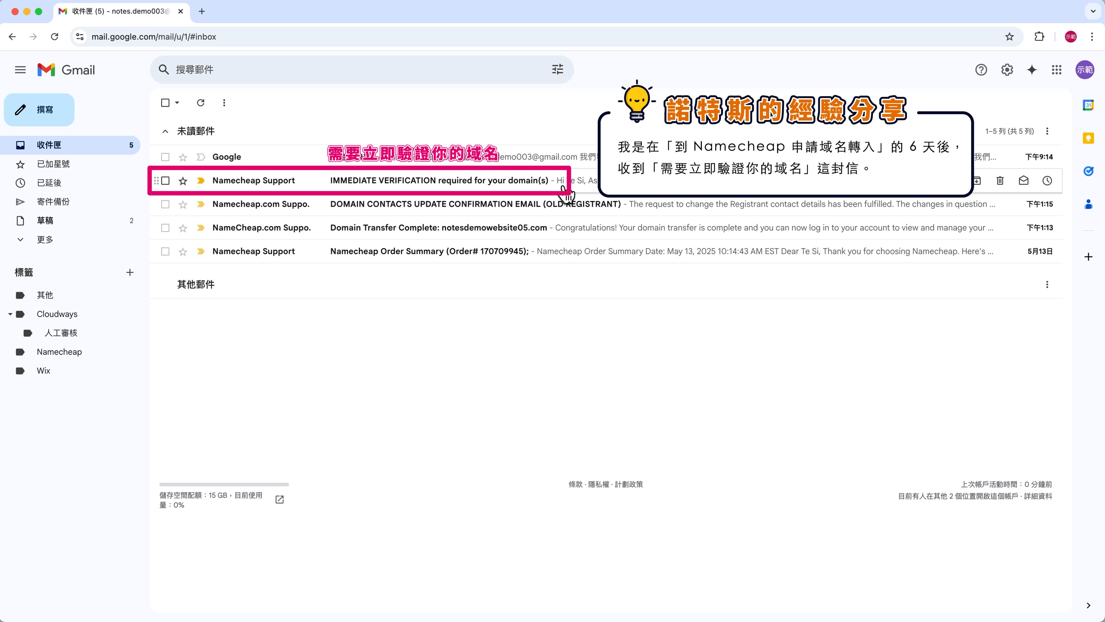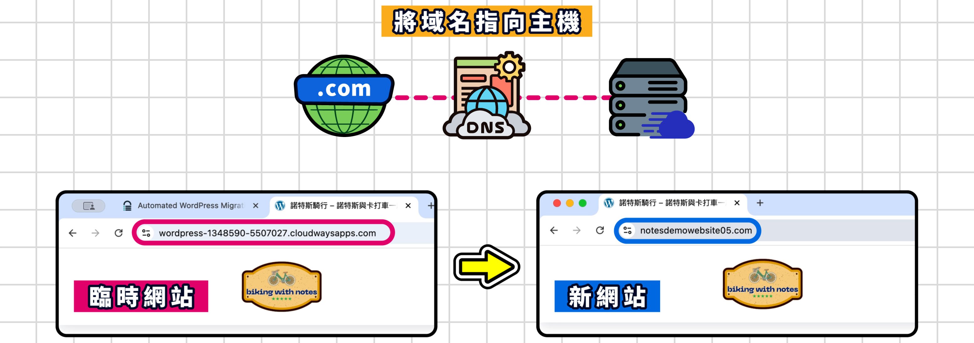 | 新網站 | Cloudways 主機 | Namecheap 域名 (例:notesdemowebsite05.com) |