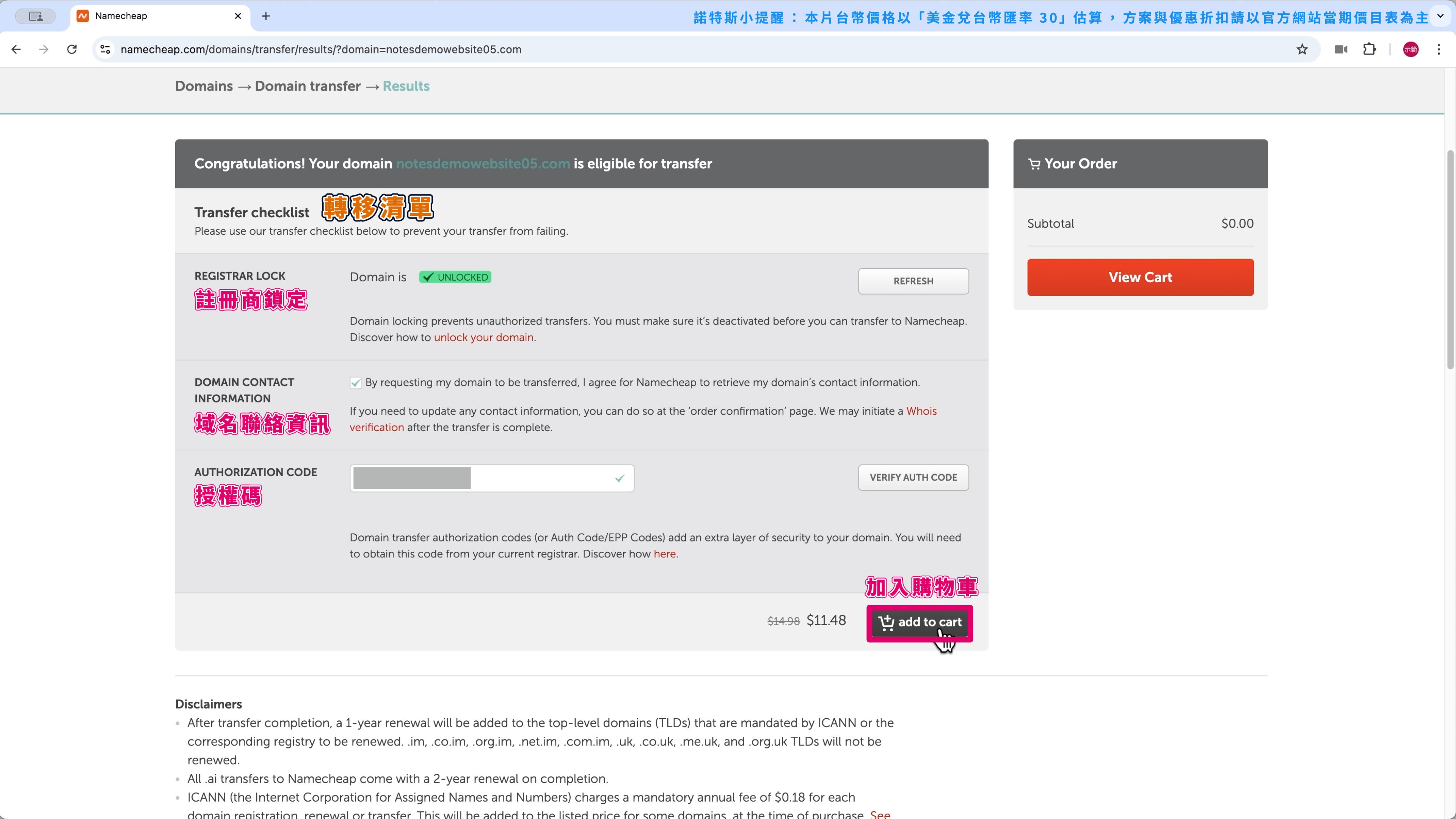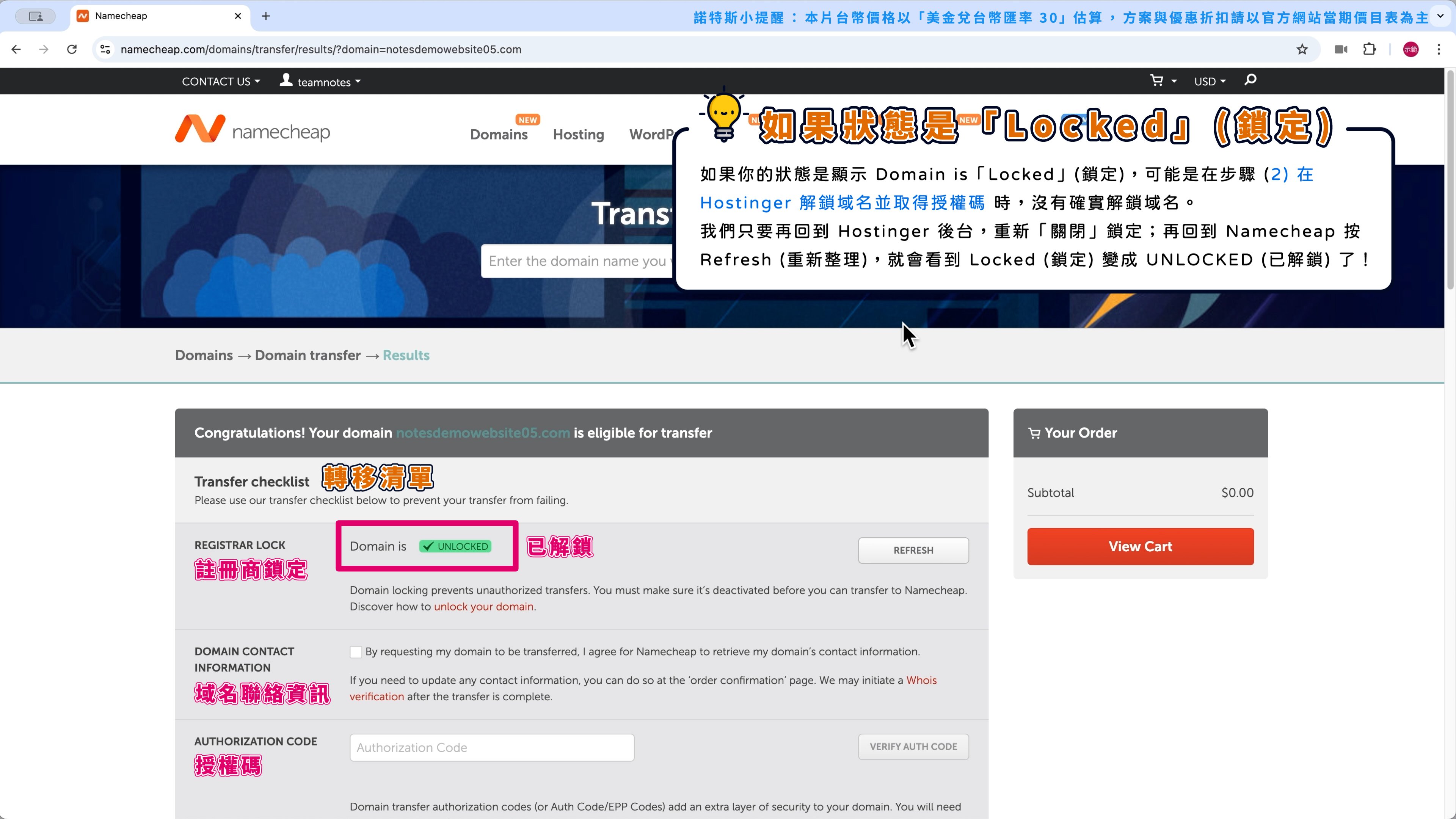 第 2 步,申請把域名從 Hostinger 轉移到 Namecheap。