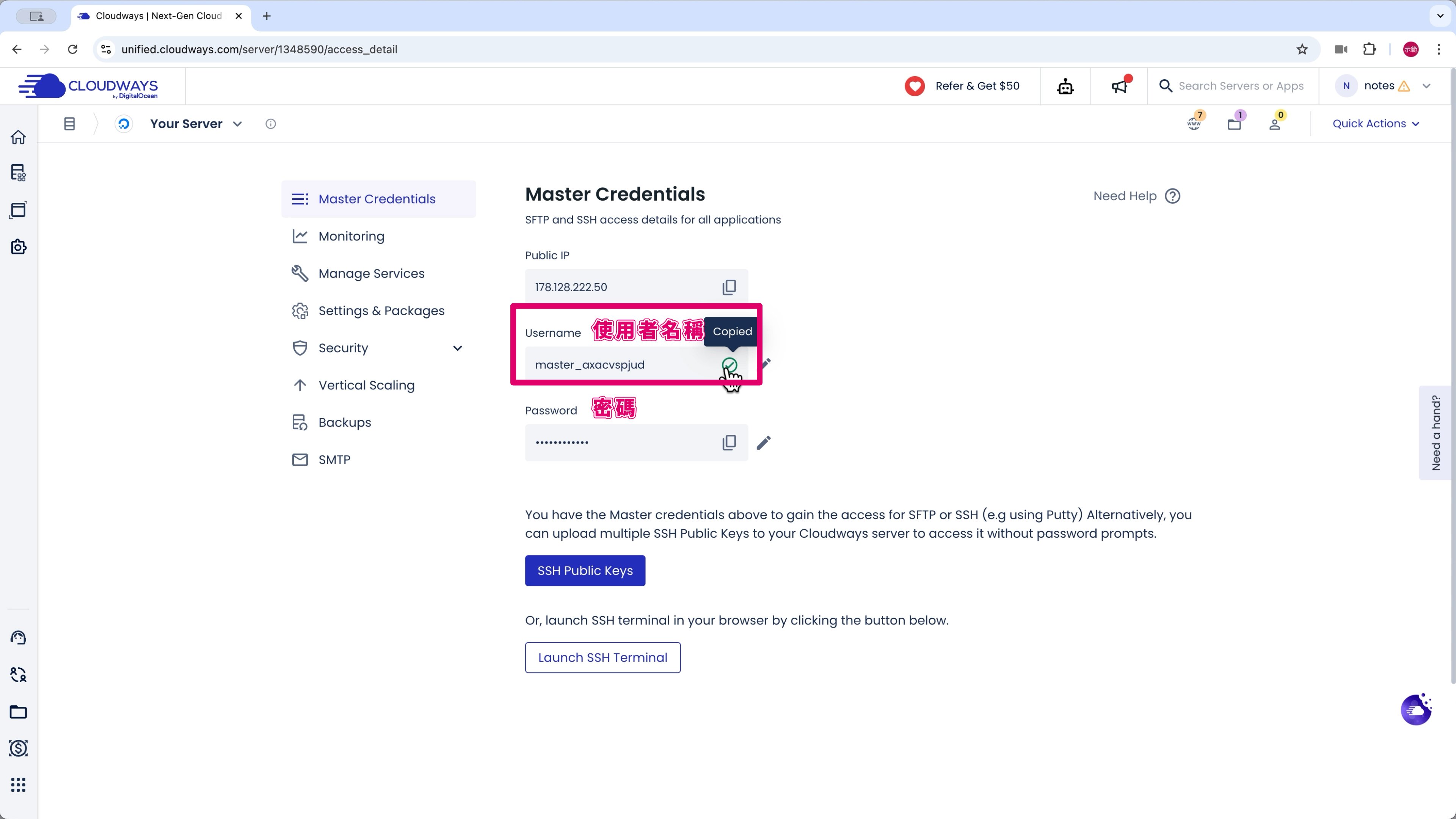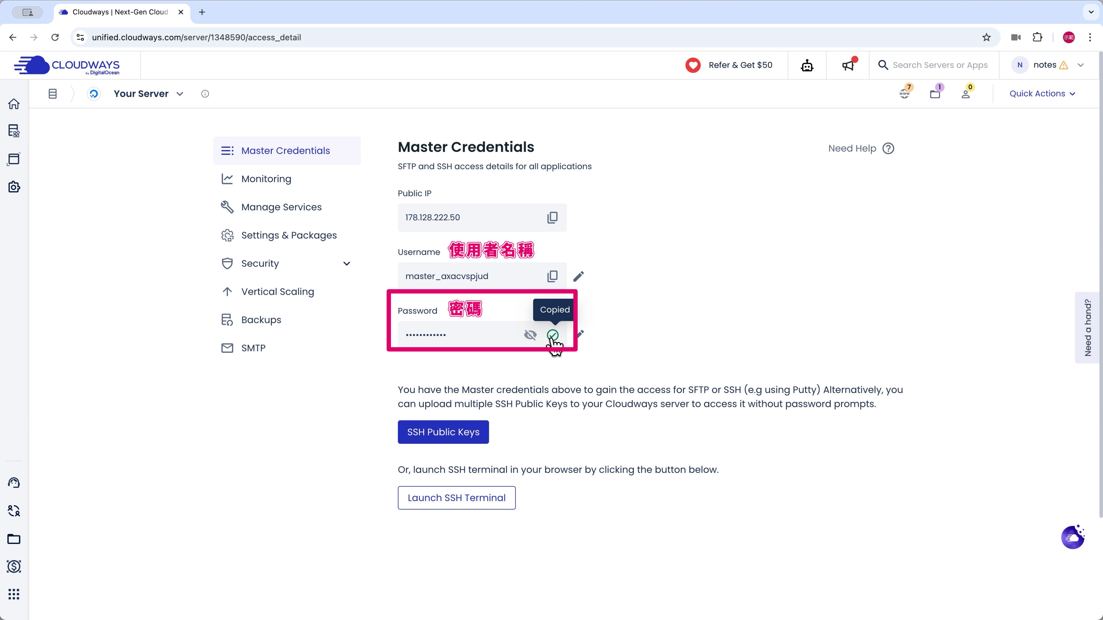 到 Cloudways 後台的 Your Application (你的應用程式) 複製「Public IP」(公共 IP)。