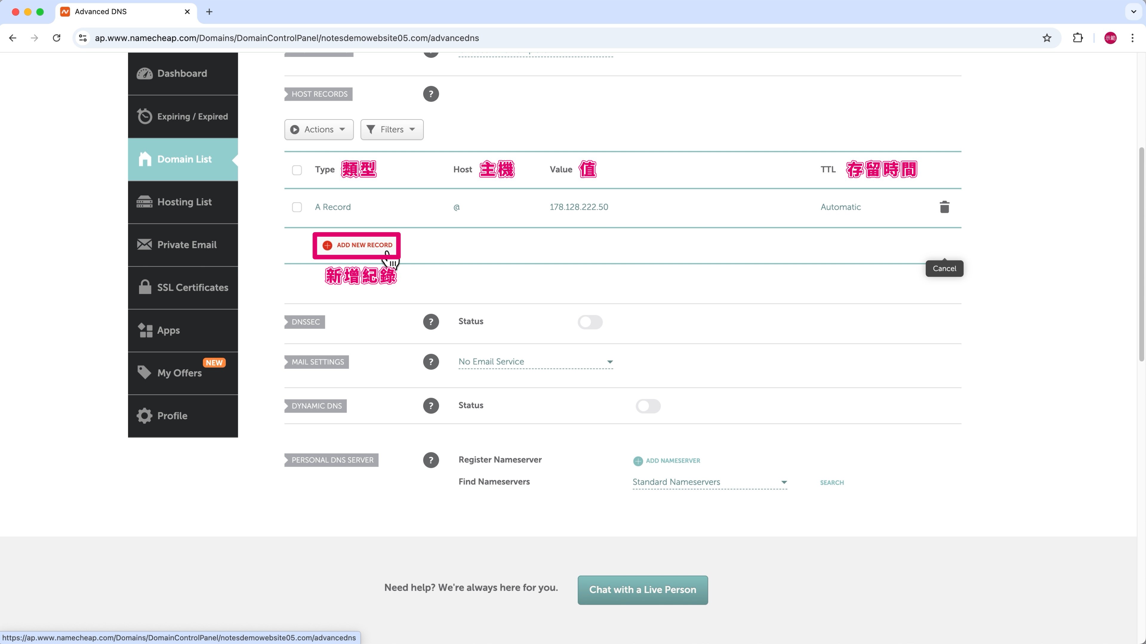 在 Host 欄位填寫「@」時,這代表你的整個網域,也就是主域名。